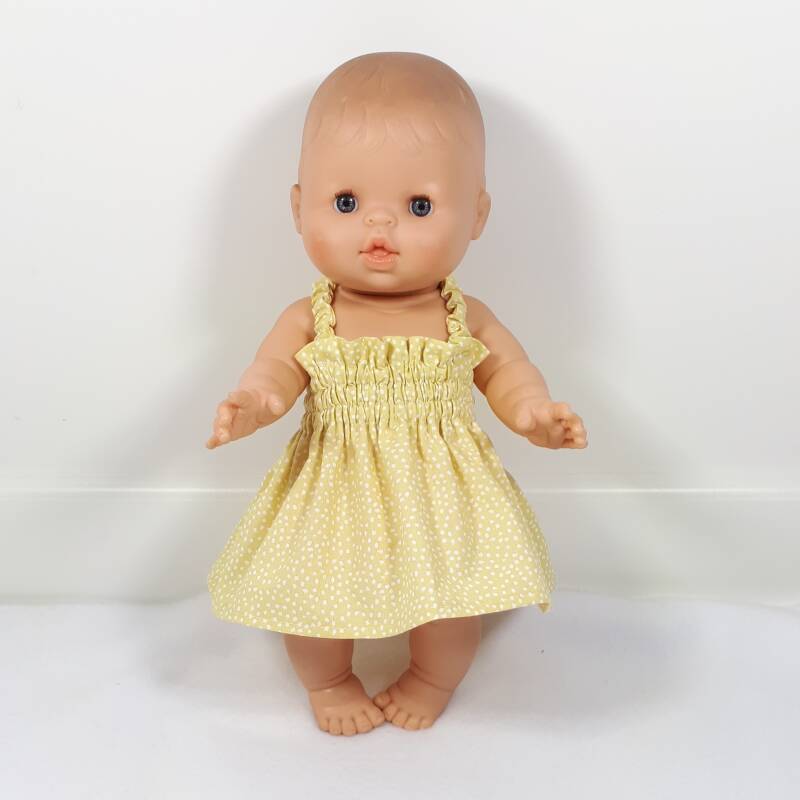 Voor het jurkje zou dat smokwerk ook leuk geweest zijn, maar ik ben bang dat het door kleine kinderhandjes stuk getrokken wordt bij het aan- en uitkleden van de pop.