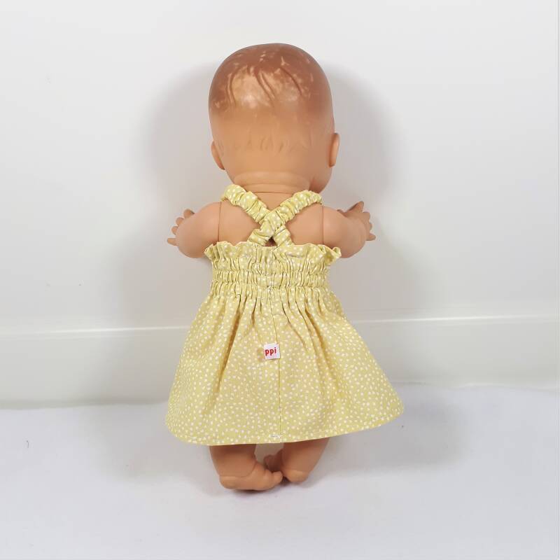 Ook de spaghettibandjes zijn elastisch. Daardoor kunnen ze gewoon over de armen worden getrokken. Ik heb de bandjes op de rug gekruist, zodat ze niet van de schouders zakken. Daardoor is het jurkje misschien iets ingewikkelder om aan te trekken door de jongste poppenkindjes.
