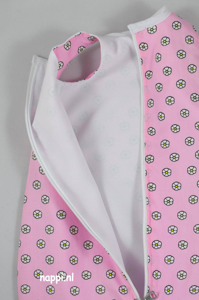 Met gepaste trots laat ik jullie gelijk even zien hoe netjes ik de kleertjes probeer af te werken. De slaapzak bijvoorbeeld is gevoerd en daarom zie je geen lelijke stiksels of rafels. De halslijn is afgewerkt met biaisband, dat is lekker stevig en daarom geschikt voor kinderhandjes, die nog niet zo gemakkelijk een pop kunnen aankleden. Dan kunnen ze er tenminste een beetje aan trekken zonder dat het kapot gaat....