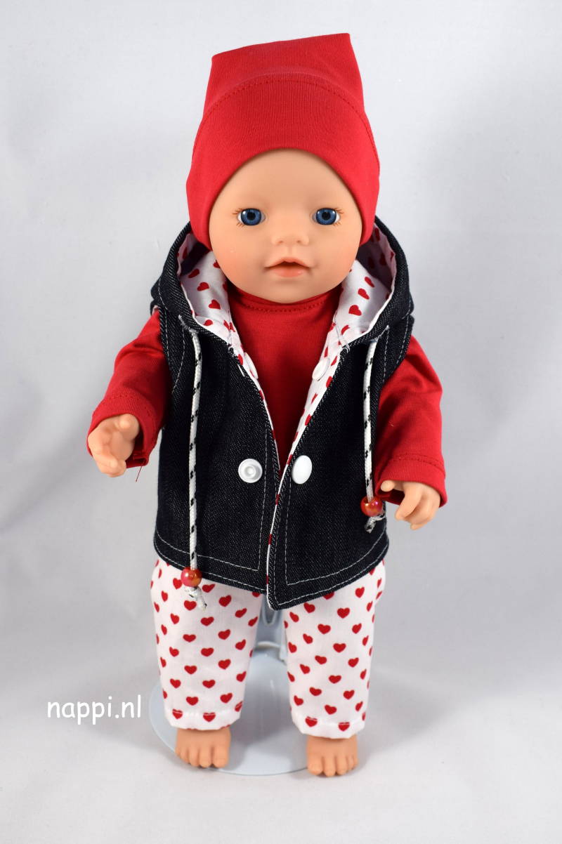 De set bestaat uit een stoere bodywarmer van stevige jeans, een katoenen broekje, een rood t-shirt en een beanie van dezelfde rode tricot als het shirt.