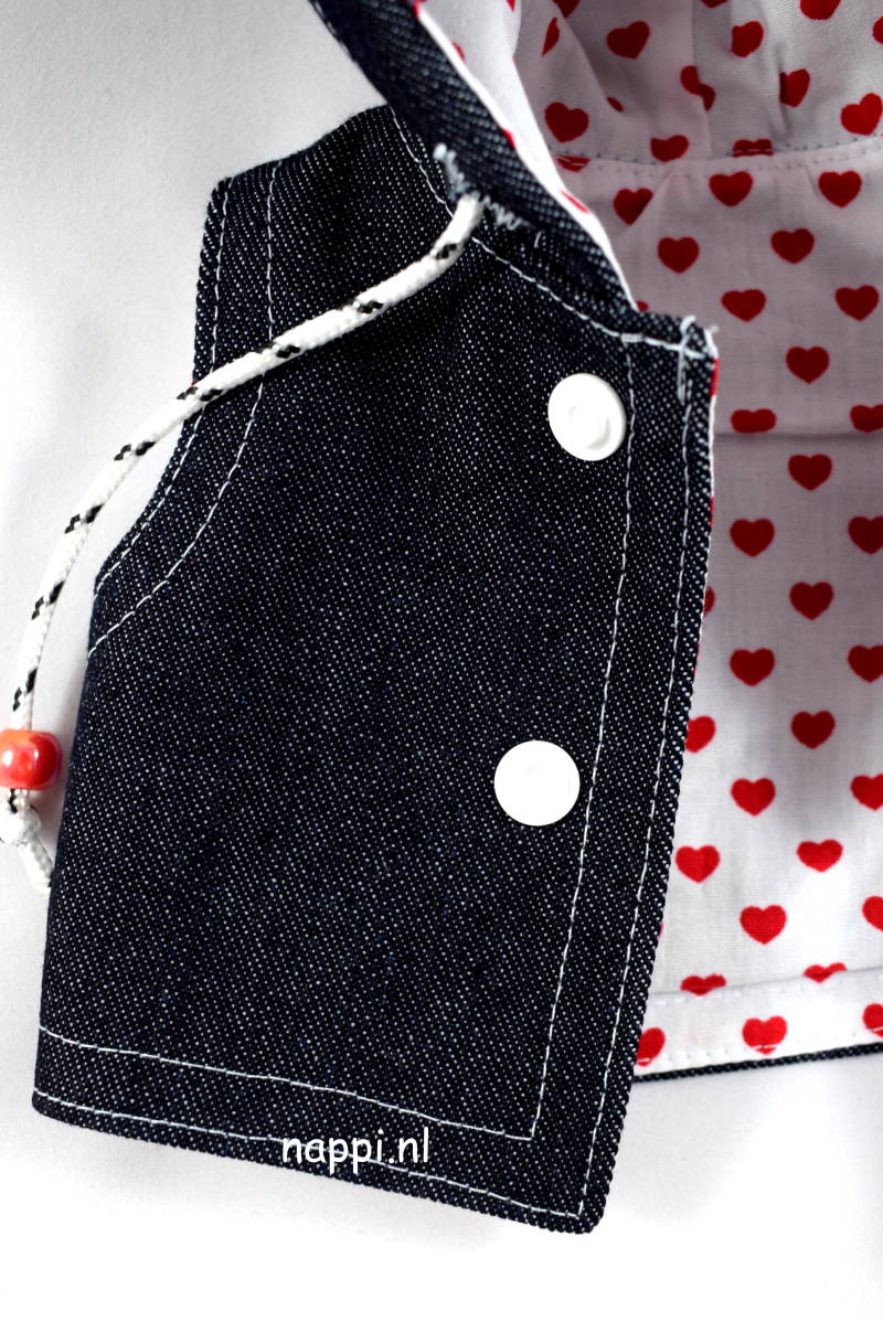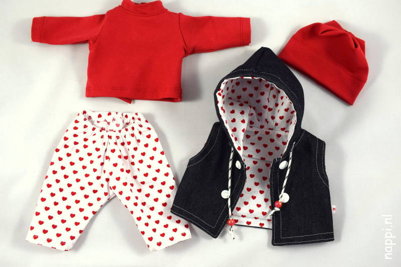 Vooral de bodywarmer was leuk om te maken! Ik heb het al meer gezegd: tijdens het naaien word ik steeds enthousiaster. Als voering gebruikte ik dezelfde katoen als voor het broekje. Wit met rode hartjes. De bodywarmer vraagt om stoere details, zoals de stiksels en de witte drukknoopjes. Het t-shirt en het broekje heb ik heel eenvoudig gehouden, want alle aandacht mag naar de bodywarmer.