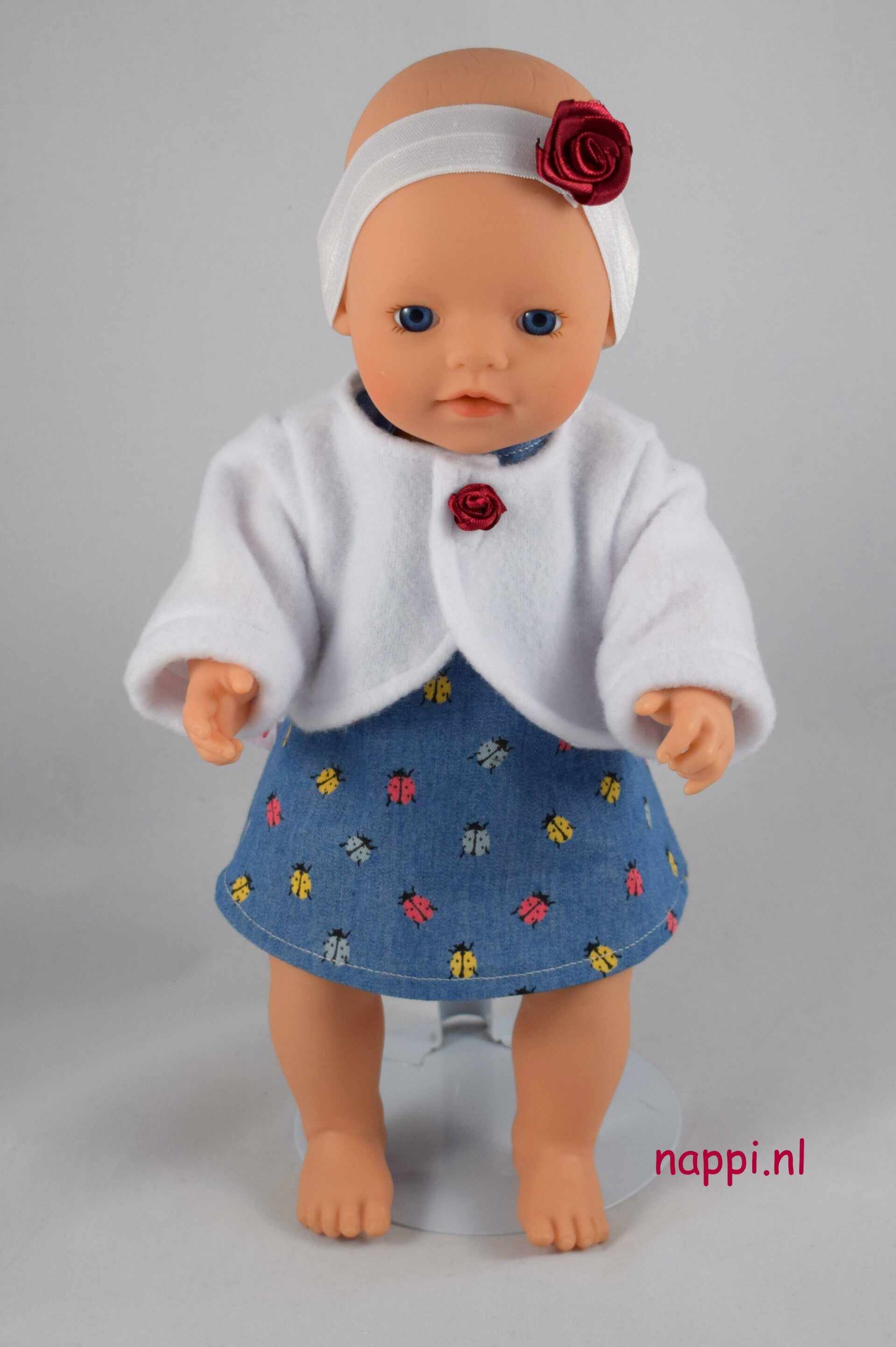 Voor Baby Born maak ik ze al lang, de bolero's en ze zijn geweldig populair. Daarom vond ik dat er ook één moest komen voor de kleine pop. Deze week kreeg ik dus "het voorjaar in de kop" en ging ermee aan de slag. Met goed resultaat, al zeg ik het zelf. Op de afbeelding hiernaast zie je het complete setje.