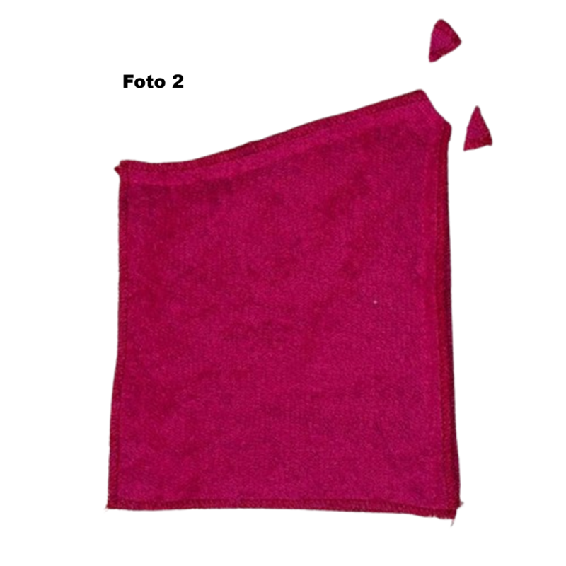 Vouw de poncho in de lengte dubbel. Er ontstaat nu een stofvouw. Markeer bij deze stofvouw het midden. Leg patroondeel 2 (de halsuitsnijding) langs de stofvouw met het midden van de halsuitsnijding op het midden van de poncho. Zie foto 1. Knip langs het patroondeel de halsuitsnijding uit. (let op: geen naadtoeslag!)