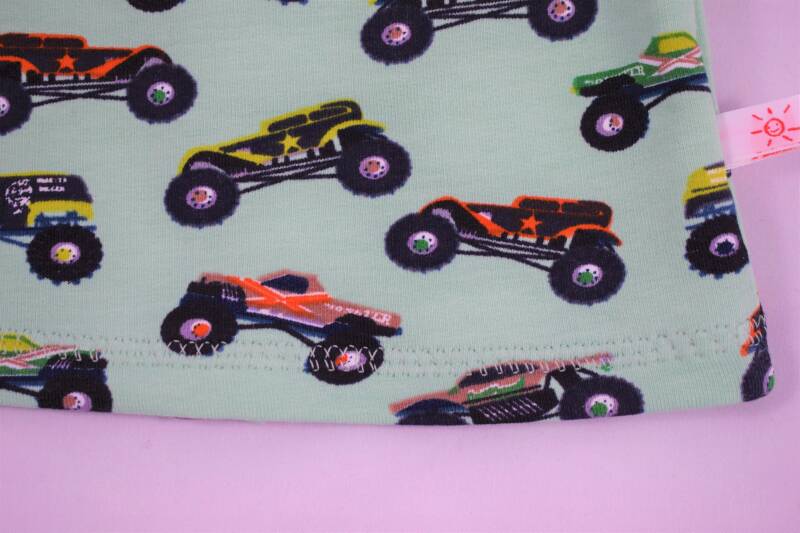 Over de pijp van dit spijkerbroekje rijdt een hele colonne vrachtautootjes. Leuk he!