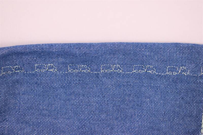Onder aan de gulp naaide ik een trensje. Je kunt de naaimachine zó instellen dat hij dat automatisch op de gewenste lengte doet. Hier naaide ik het trensje voor de sier, maar op de uiteinde van een naad is het een goede versteviging. De naad zal dan niet snel inscheuren als het kindje een beetje moeite heeft met het aantrekken van de kleertjes.