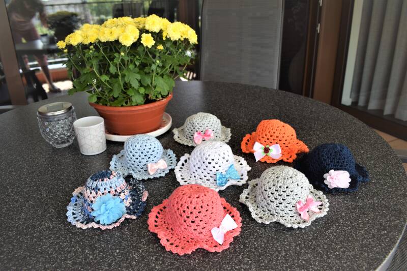 Ik haakte alle hoedjes op de foto met Catania katoen en haaknaald 3.5. Ik raad aan om tussendoor het hoedje regelmatig te passen. Als je met een haaknaald groter of kleiner haakt of andere katoen/wol gebruikt, kan het zijn dat het hoedje groter of kleiner wordt, pas dan het patroon aan.