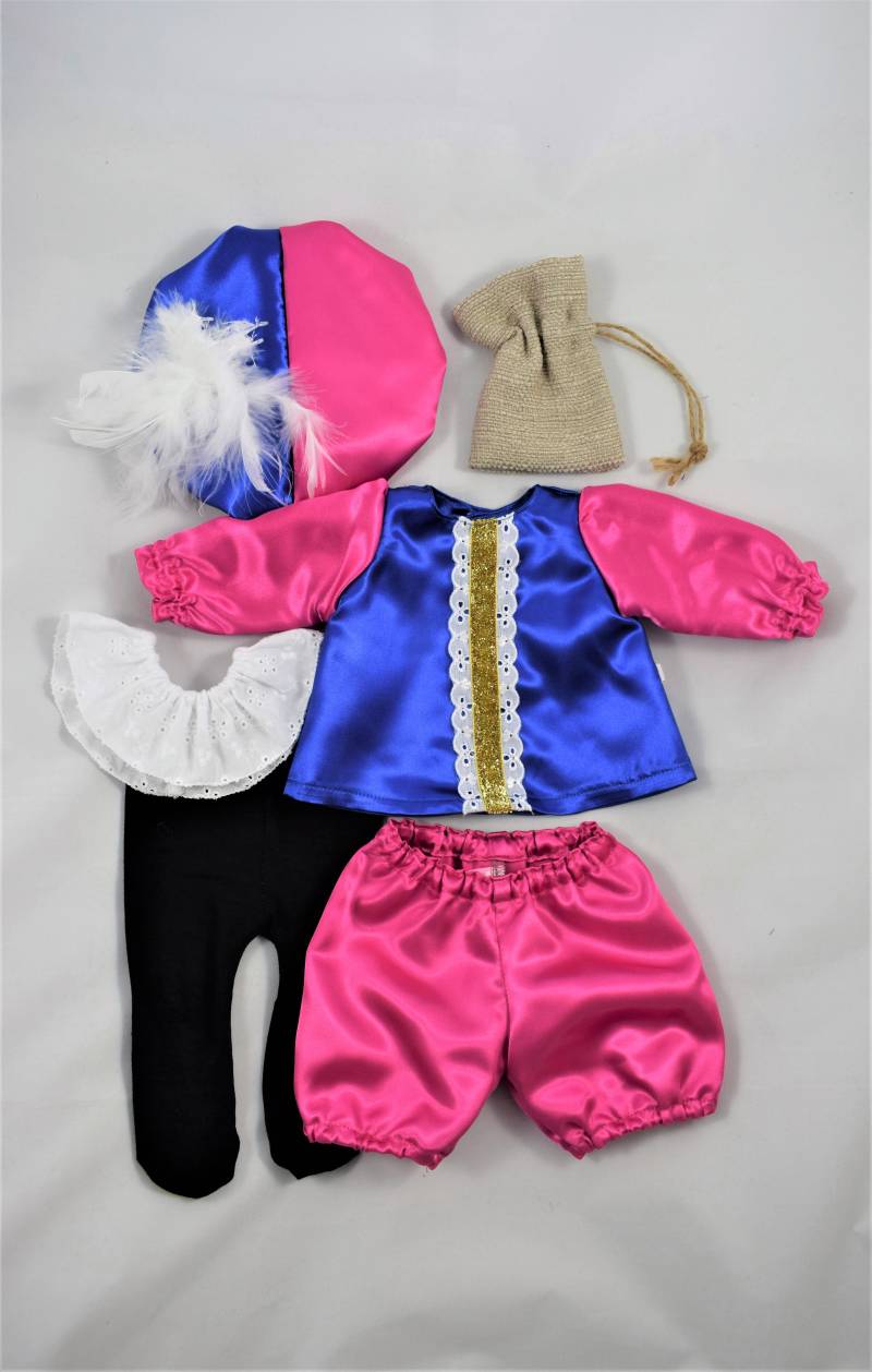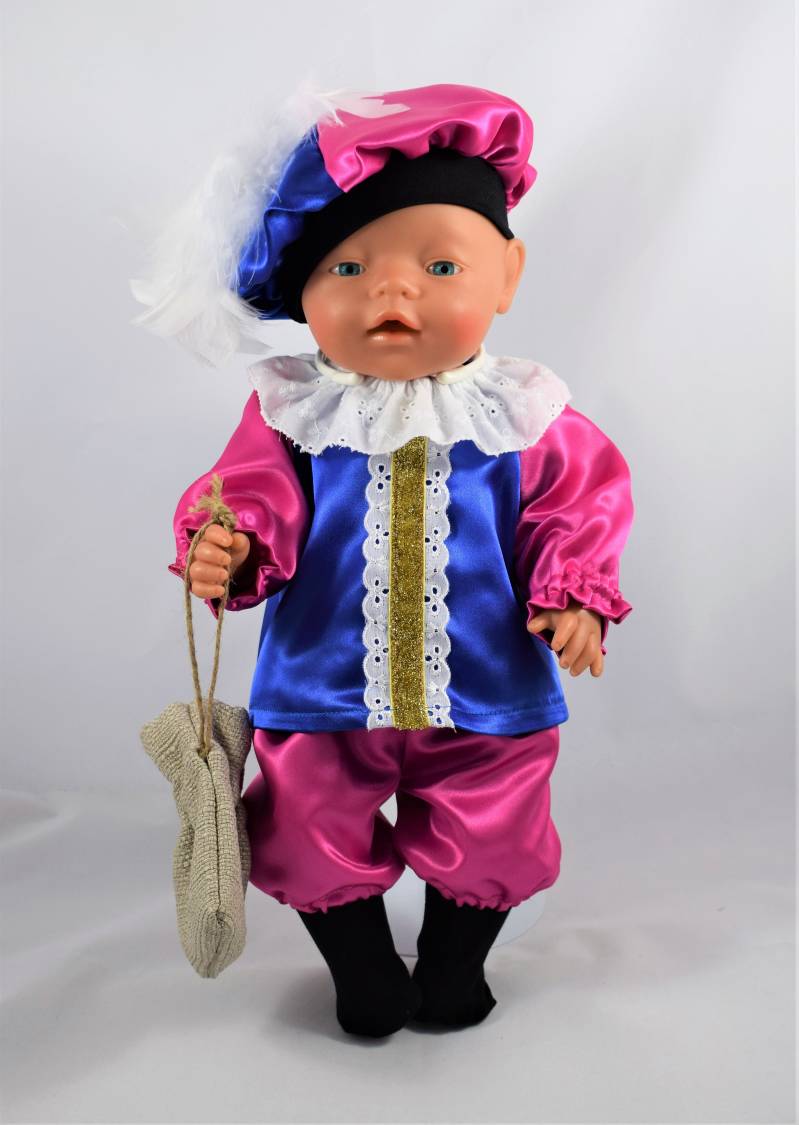 Maar goed, ik vertelde dat dit patroon heel uitgebreid is. Dat komt omdat het Pietenpak maar liefst uit zes delen bestaat: een baret, kraag, hes, pofbroek, maillot en strooizakje. En van alle delen is er een duidelijke werkbeschrijving gemaakt, met foto's. Zo is het voor jou niet te moeilijk om ook zo'n mooi Pietenpakje voor Baby Born of een andere pop van 40-45 cm. te maken. (Enige naai-ervaring is wel handig bij dit patroon).