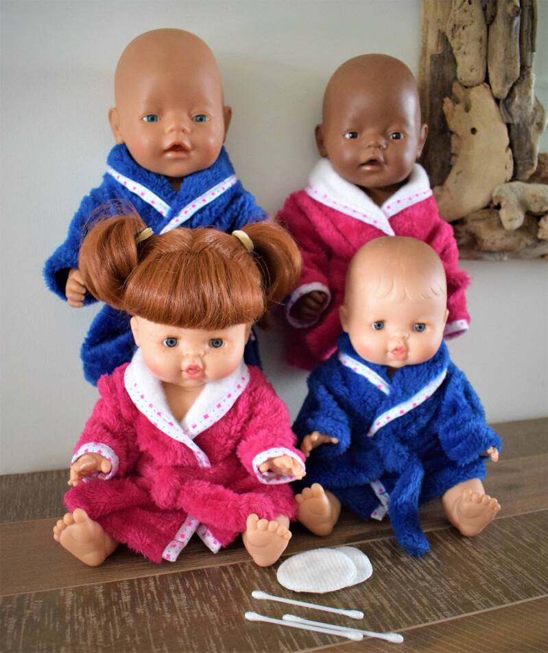 Afgelopen week maakte ik een aantal knuffelzachte badjasjes voor de pop. In mijn voorraadkast had ik al een tijdje deze stof liggen, maar gek genoeg heb ik de neiging om alleen maar kledingsetjes voor de pop te maken. Terwijl ik me echt wel realiseer dat met poppen spelen voor een kind meer is dan alleen maar aan- en uitkleden. De fantasie van een kind gaat een stuk verder. Denk bijvoorbeeld aan badderen, slapen, eten geven en verschonen van de pop. Dat hoort er allemaal bij.
