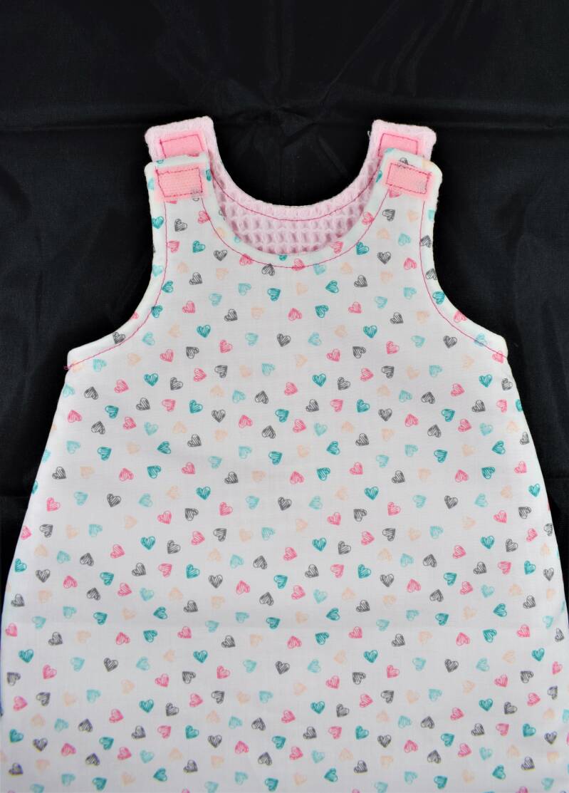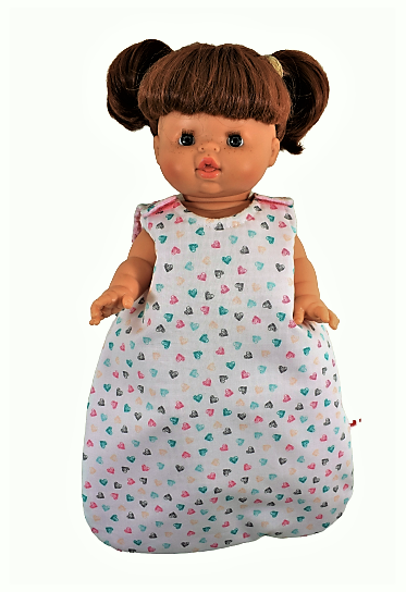 Zoals je ziet sluit de slaapzak nu eenvoudig met klittenband op de schouders. En dat is dan ook weer een voordeel voor die kleine kinderhandjes. Het poppenkind schuift nu als het ware de pop in de slaapzak en plakt eenvoudig het klittenband op elkaar.