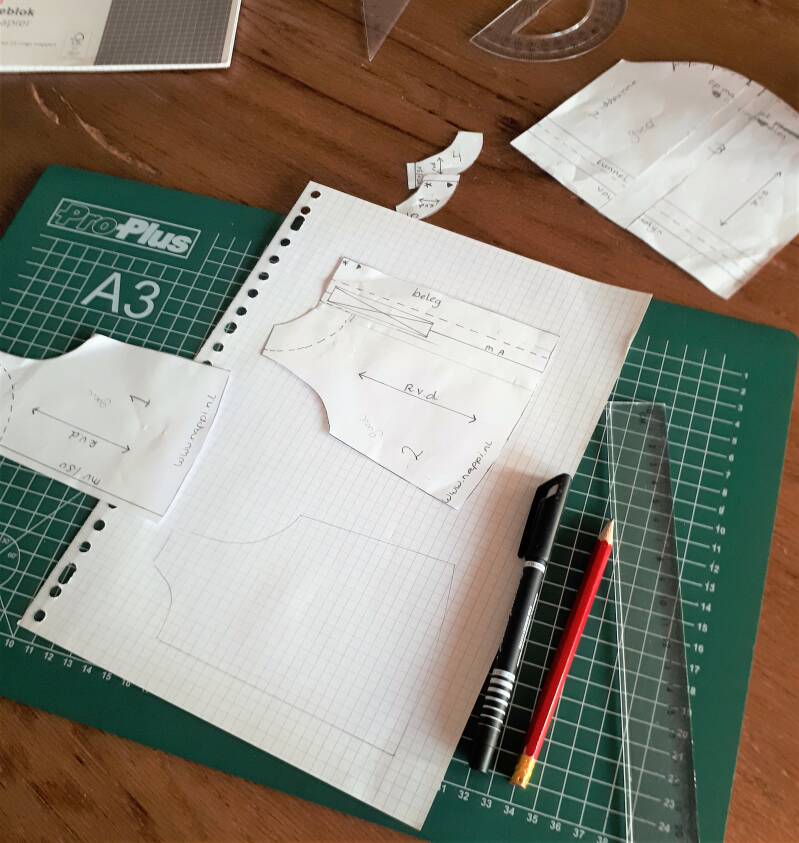 <--Als Sylvia en ik beiden tevreden zijn dan wordt het patroon "officieel" uitgewerkt. Ik teken de patroonlijnen met een zwarte dunschrijver in en lees voor de laatste keer de werkbeschrijving nog eens kritisch door. Daarna maak ik van het patroon een PDF en sla alles netjes op op mijn laptop. Het patroon is klaar om verkocht te worden.