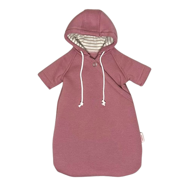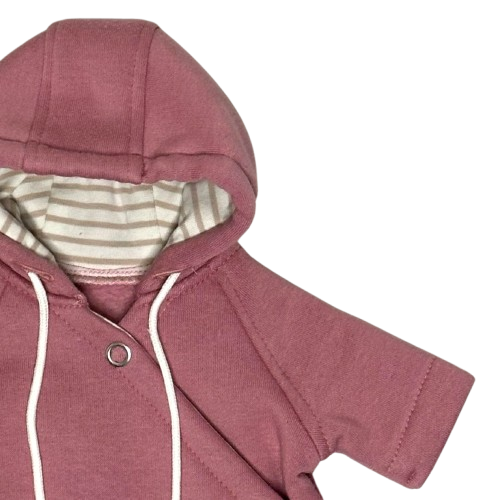 De slaapzak sluit met een babydrukker vóór. De capuchon is gevoerd.