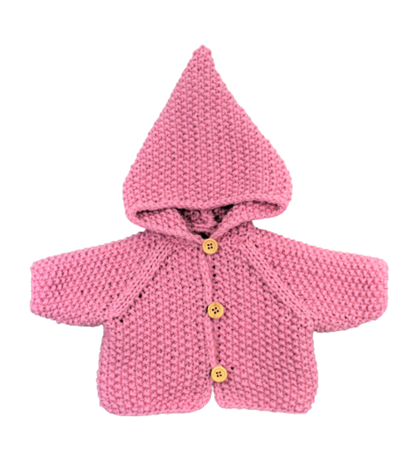 Dit jasje is toch supermooi! Gebreid in gerstekorrelsteek met naalden nummer 5. Daardoor heeft het een stoere uitstraling. Ook leuk is de capuchon, die uitloopt op een punt.
