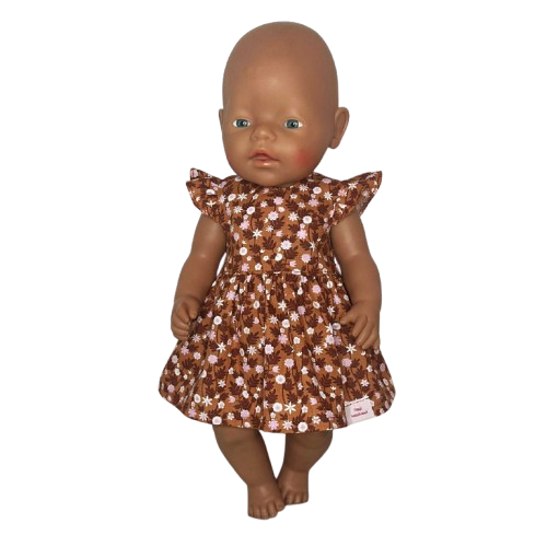 Dit schattige poppenjurkje heeft ruffles op de schouders en een wijd rokje. Het jurkje is van achter geheel open en sluit met klittenband. Daardoor is het ook heel geschikt voor beginnende poppenouders.