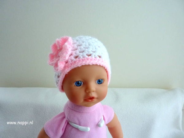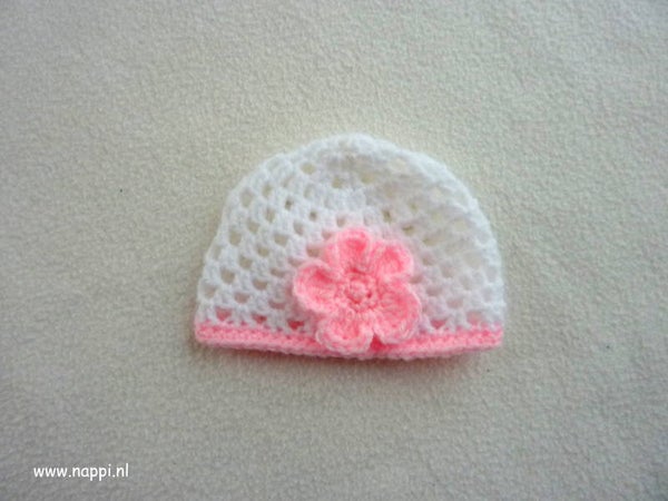 Een muts die goed past! Gehaakt, in wit met roze accenten.